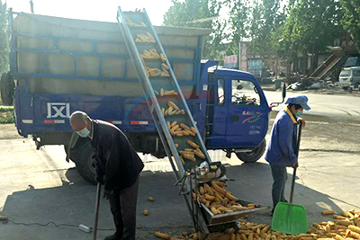 看看他们都是怎么装车的,下线收粮食,门市部装车、卸货都是用这种折叠式装车皮带输送机,电机220V单相电就可以用,实在太方便了。